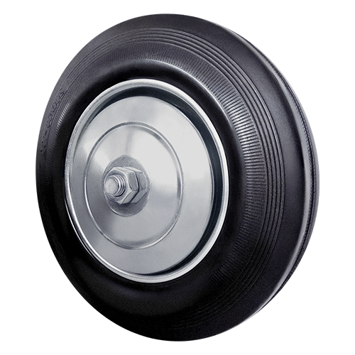 Серия колес с литой резиновой шинкой черного цвета и стальным оцинкованным ободом. Оснащены роликовым подшипником, который выдерживает большие нагрузки по сравнению с подшипником скольжения.